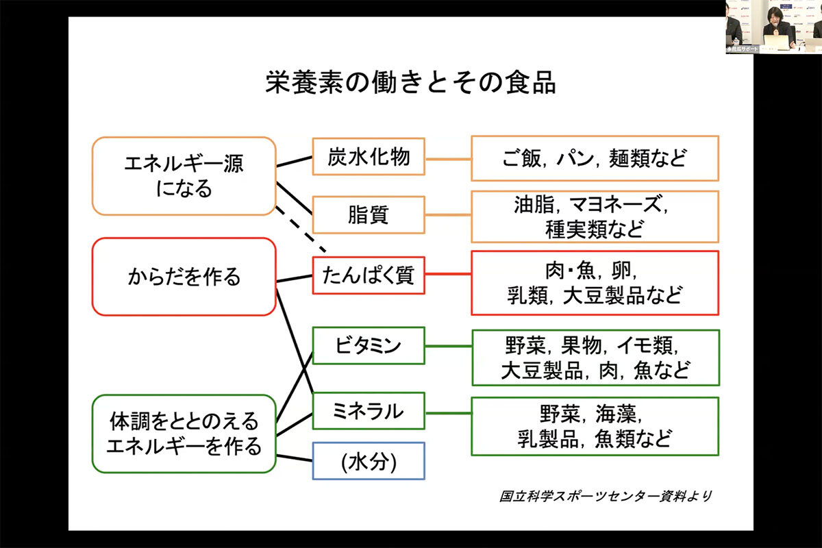 1つ目は、パフォーマンスを向上すること。もう一つは、身体活動量が増えるわけですから、それに対するエネルギー量、栄養素を食べていく、栄養を摂取すること、この大きな2つの意味があると考えられます。