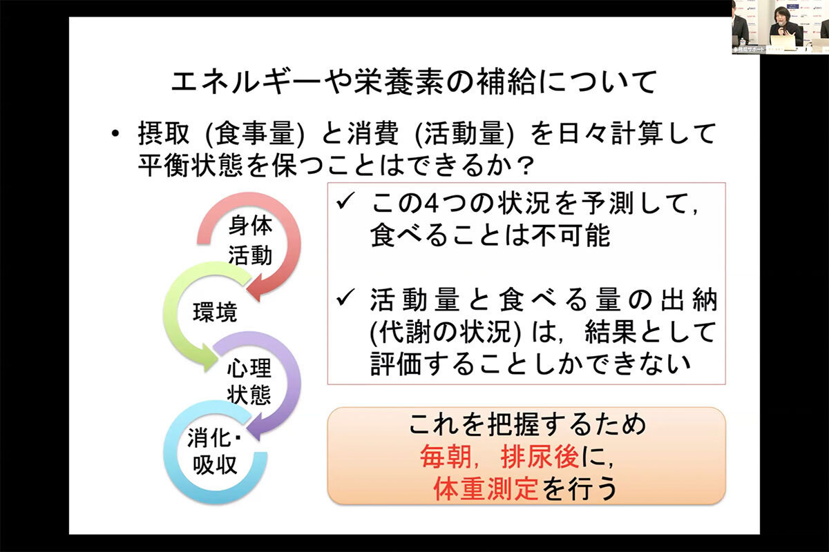 その日によってコンディションも変わるなかで、「身体活動」「環境」「心理状態」「消化・吸収」といった4つの観点を持って「今日はこのぐらい運動するだろうからこのぐらいの量を食べよう」と考えて食べることは難しく、自分が今日動いた量に対してちゃんと食べていたかを判定するには、次の日の朝一の排尿後に、毎日同じ格好で体重測定することが必要になります。