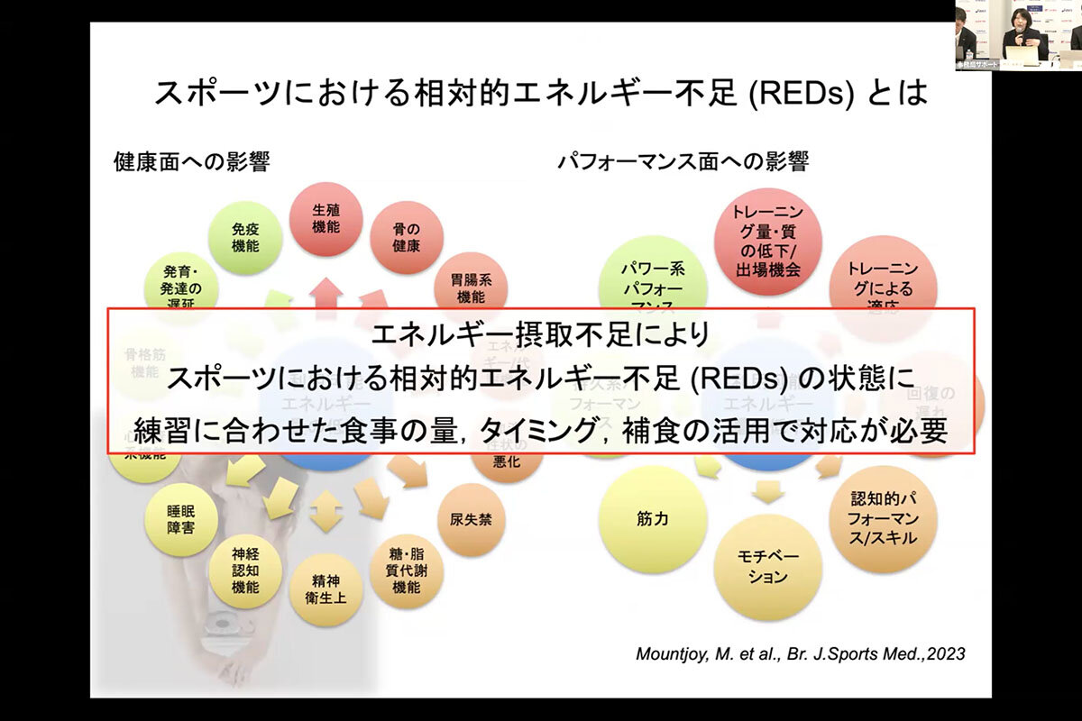 日々のエネルギー摂取が不足してくると、慢性的に日々生活していくためのエネルギーが足りなくなります。そうすると、スポーツにおける相対的エネルギー不足(REDs)の状態に陥ってしまいます。その日の練習に合わせて、食事量や食べるタイミング、補食を活用するなどの対応が必要になります。