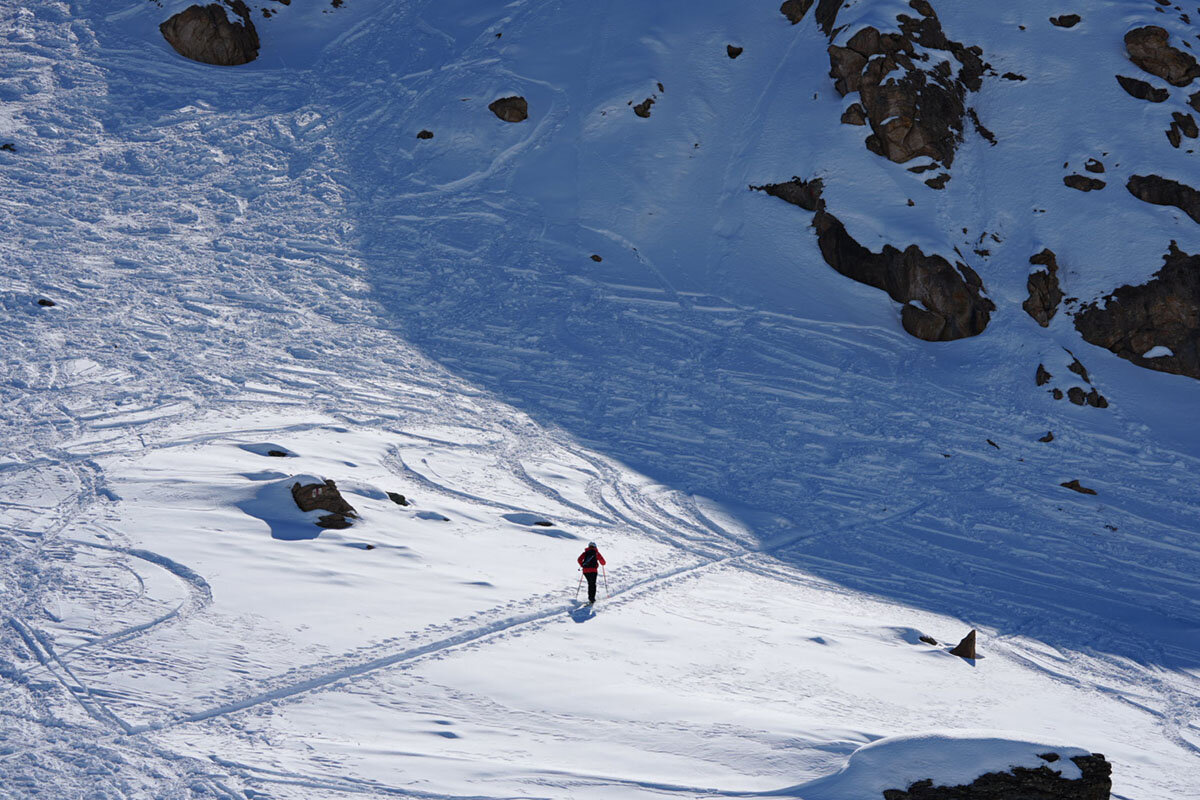 簡単に言うと、山を登って下ってタイムを競います。例えば、スプリント種目ではまずスキーの滑走面に滑り止め(クライミングスキン)をつけてスキーを履いたまま登ります。1つ目の道具の操作がおこなわれるエリア(トランジットゾーン)に着いたらスキーを外してバックパックに装着し、スキーブーツで駆け上がります。2つ目のトランジットゾーンではまたスキーを履いて登り、コースの最高地点にある3つ目のトランジットゾーンに到着したら今度はブーツとスキー板を滑走モードに変更し、スキーの滑走面についたクライミングスキンを剥がして滑走します。