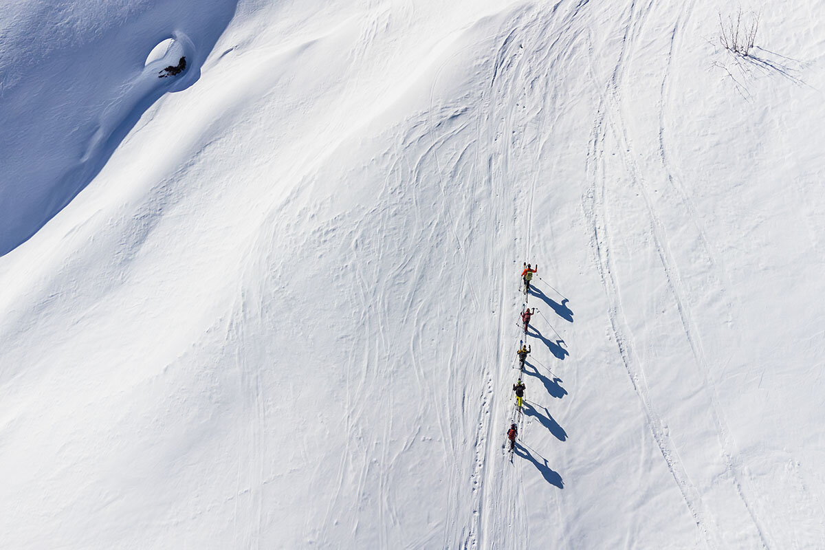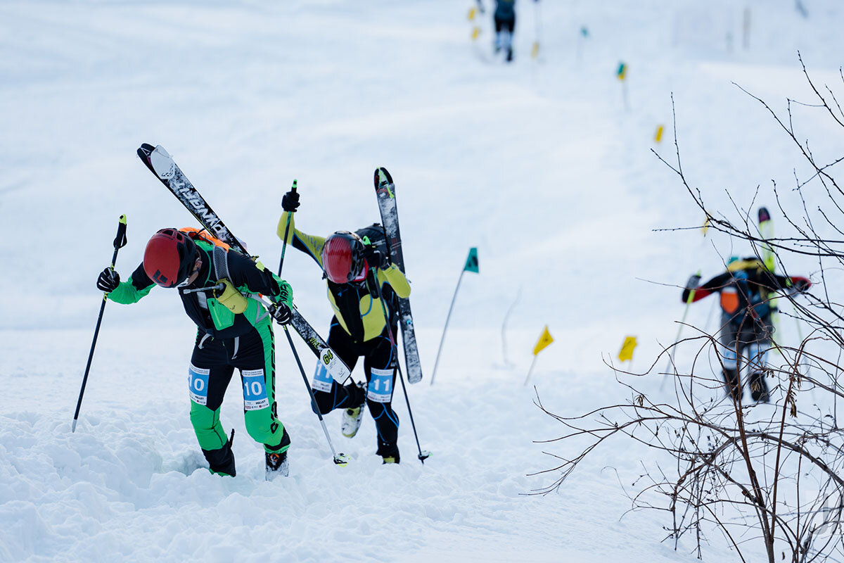 スキー板の滑走面にクライミングスキン(滑り止め)を貼って登る区間、バックパックにスキー板を取り付けてブーツで登る区間、そしてスキー板での滑走区間。選手はセクションごとに決められたルールに従って雪山を駆け抜けていきます。