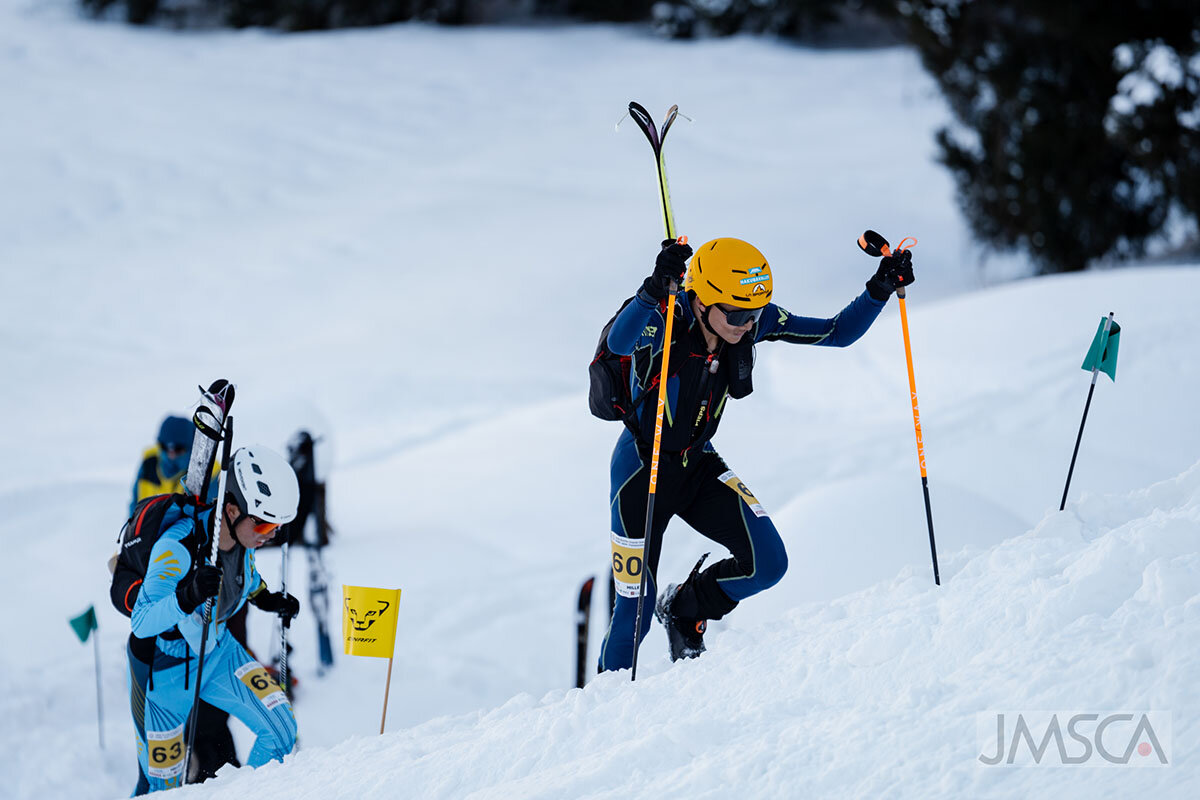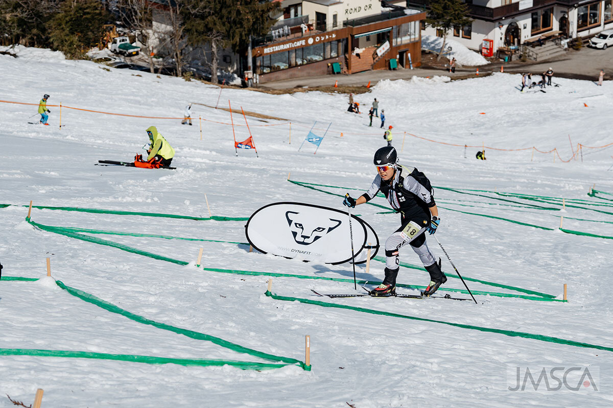 コースにはスキー+クライミングスキンでの登り、ブーツでの登り、スキーでの滑走といったSKIMOの基本的なセクションが含まれ、用具の付け外しをおこなうトランジットエリアでの作業の素早さが重要な見どころとなります。