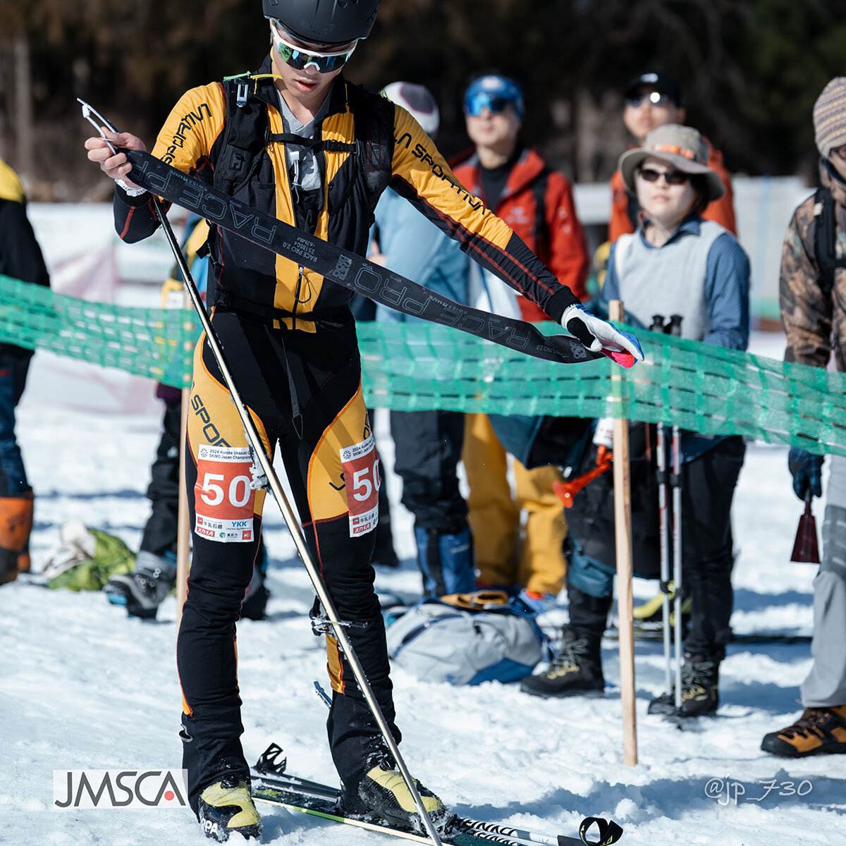 スタートからスキー+クライミングスキンによる登りのセクションと、スキー板を外してバックパックに取り付けてブーツで駆け上がるセクション、そして登った地点からスキーで滑走し旗門を通過するセクションがあり、それらを3~4分という短時間のなかで通過しゴールするまさにスピード勝負のレース。レース前にはコースの下見(インスペクション)がおこなわれます。
